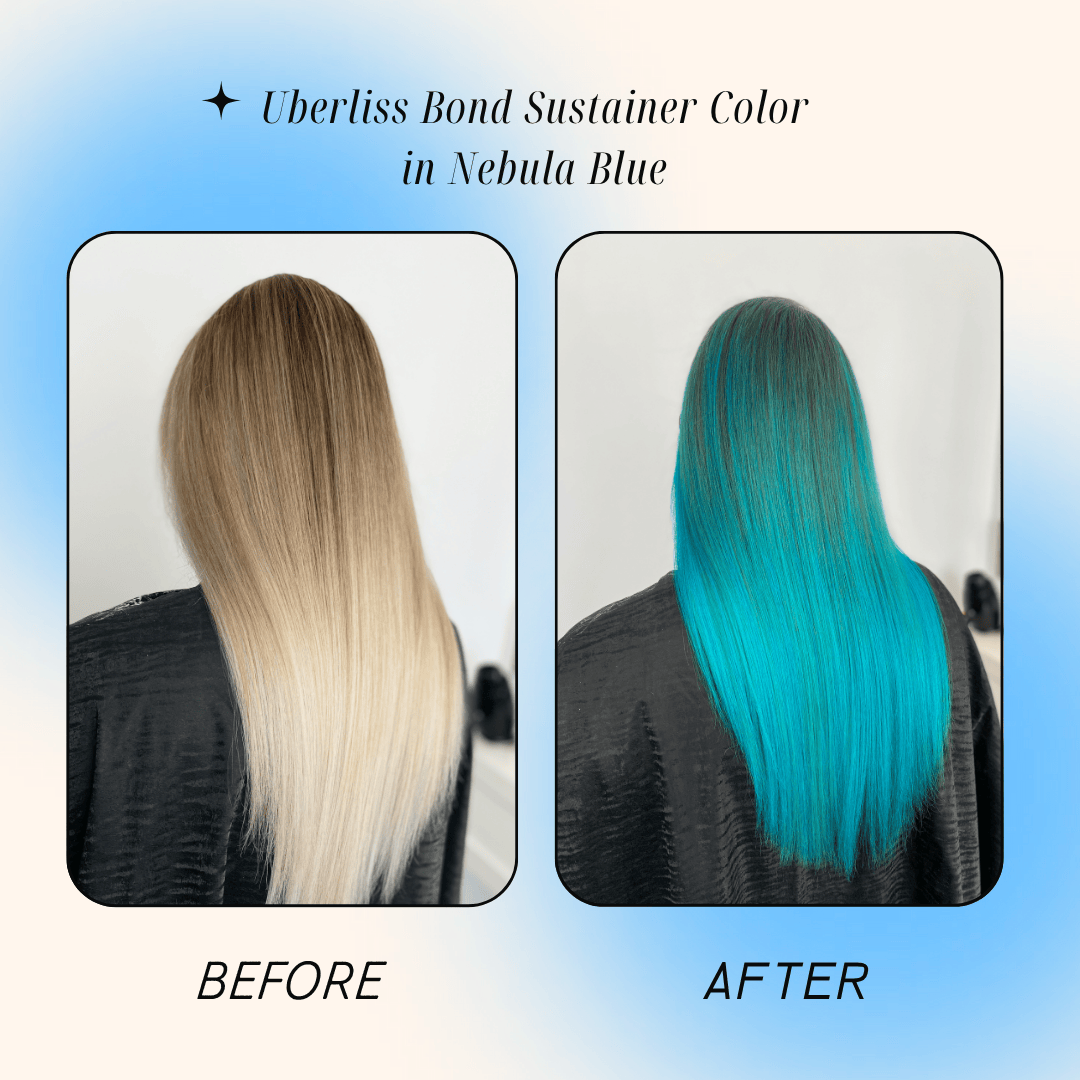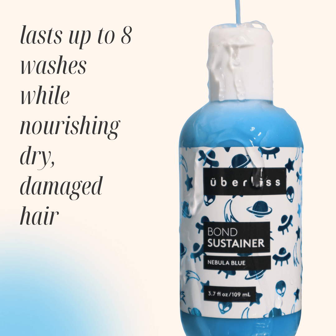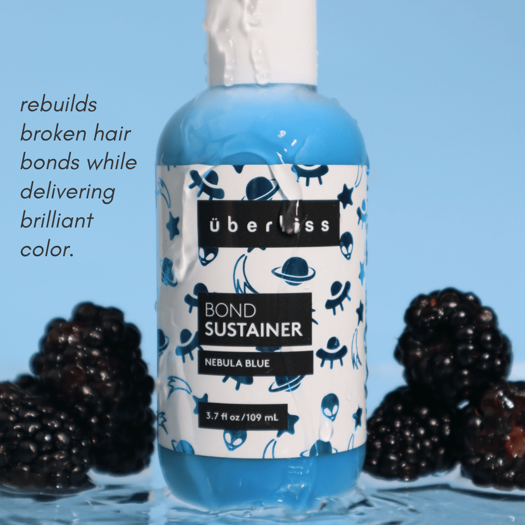 Bond Sustainer Nebula Blue deposits vibrant color that lasts up to 8 washes while nourishing dry, damaged hair and regenerating broken hair bonds