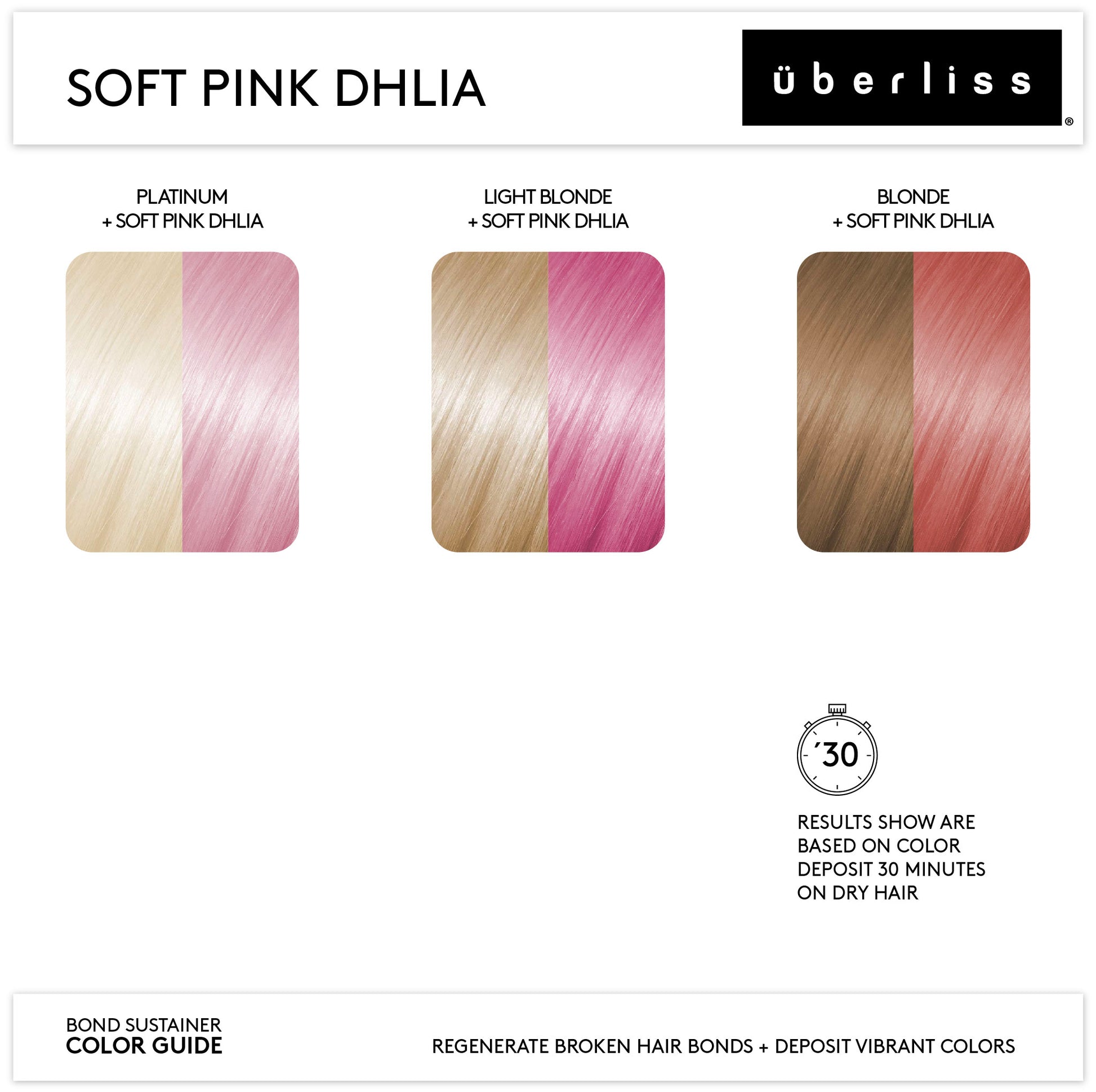 Soft Pink Dahlia can be applied to levels 10 or 11 blonde for vibrant results. Results may differ by hair level. See Bond Sustainer Color Guide for additional guidance.