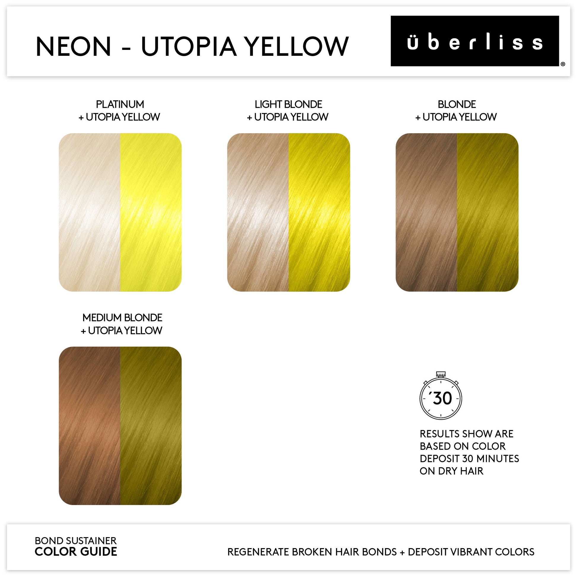 Utopia Yellow can be applied to levels 10 or 11 blonde for vibrant results. Results may differ by hair level. See Bond Sustainer Color Guide for additional guidance.